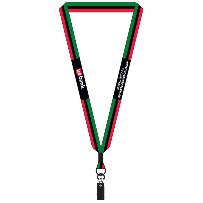 Proudly showcase your involvement, support or allyship of the Black Heritage Business Resource Group with this unique lanyard design. This ¾” dye-sublimated lanyards features a red, green and black stripe design and comes with a sturdy metal crimp, split ring and bulldog clip.