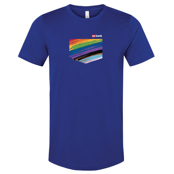 Show your support of the LGBTQ Business Resource Group with this Bella + Canvas 4.2 oz., 100% combed and ringspun cotton shirt with the U.S. Bank logo and custom Pride graphics on the front and back.