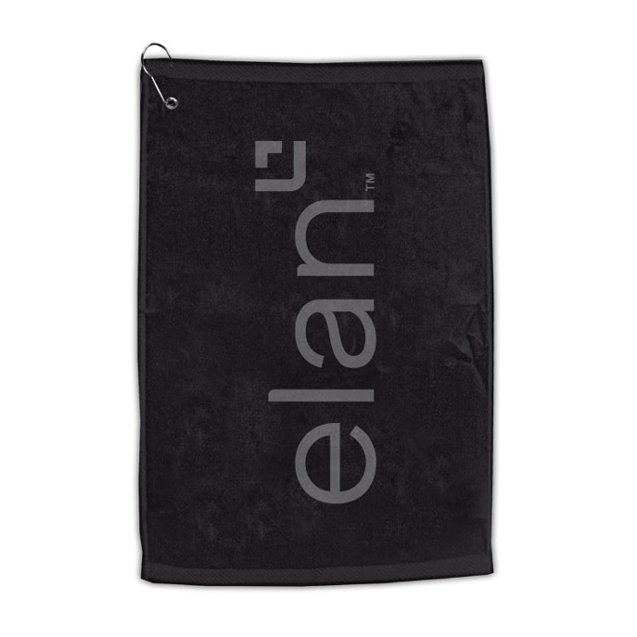 This 100% cotton velor towel is ultra-soft and absorbent. The black towel measures 16" x 24" and includes a silver hook and grommet. The Elan logo is silk screened in translucent ink for a tone-on-tone effect.