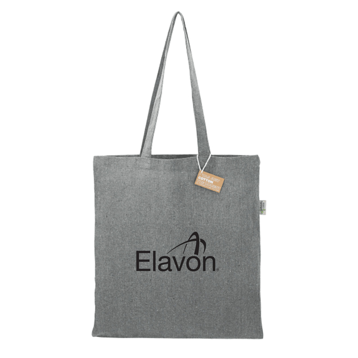 The recycled cotton tote is a truly unique way to show off your brand in a eco-friendly way. The material contains recycled cotton collected from garment cutting waste blended with recycled polyester to produce a strong reusable bag that will surely turn heads. Through a partnership with 1% For The Planet, one percent of sales of this bag will be donated to nonprofits dedicated to protecting the planet. Measures 15" H X 16.5" W with the Elavon logo screen printed on one side.