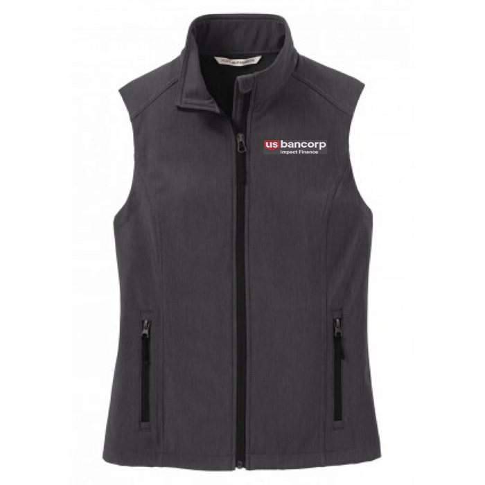 Water and wind resistant shell with reverse coil zippers, zip-through cadet collar with chin guard, front zippered pockets and open hem. Offered in black charcoal heather with the U.S. Bancorp Impact Finance logo embroidered on the left chest.