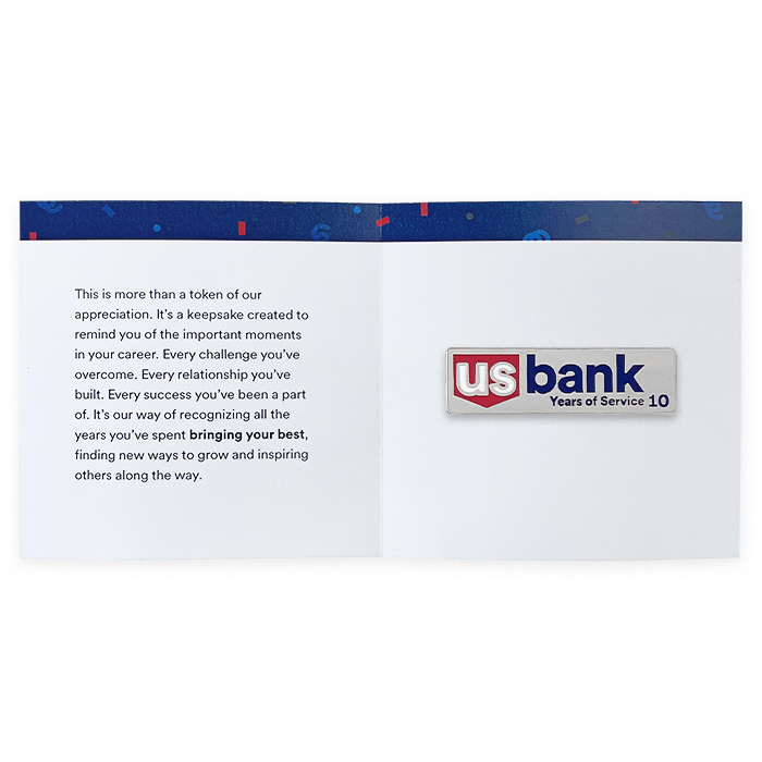 U.S. Bank lapel pin for employees with 10-14 years of service is silver colored with a magnetic back.