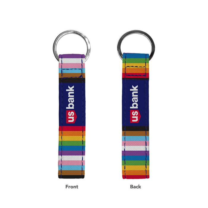 Express your support of Pride with this vegan leather key chain. This handy accessory is crafted with premium crosshatch vegan leather and printed with the U.S. Bank logo and the inclusive rainbow colors on both sides. Measures 3.93″ x 0.75″ x 0.19″.