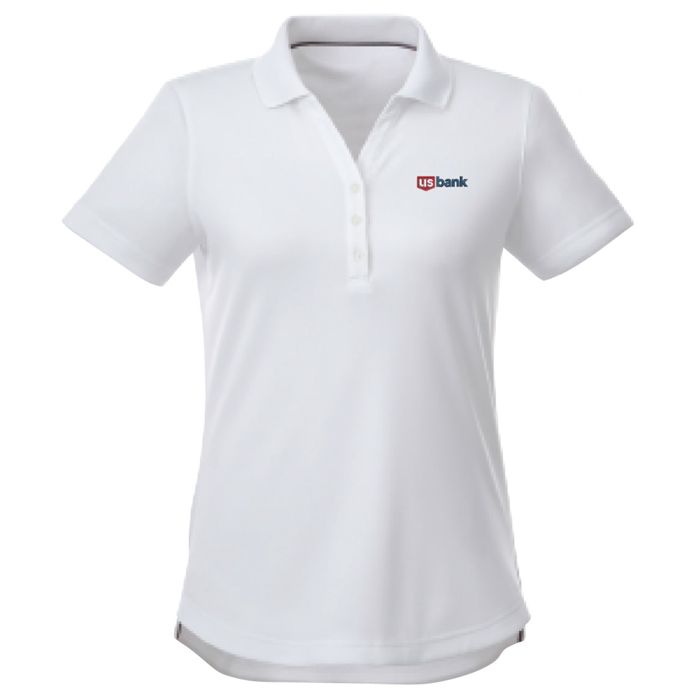This short sleeve polo is constructed with a breathable, matte finish fabric with moisture wicking properties and has a 3-button placket, shaped seams and tapered waist for a flattering fit. . The 100% polyester doubleknit birdseye mesh knit is snag resistant and provides UV protection (UPF 40+). Offered in white with the U.S. Bank logo embroidered on the left chest.