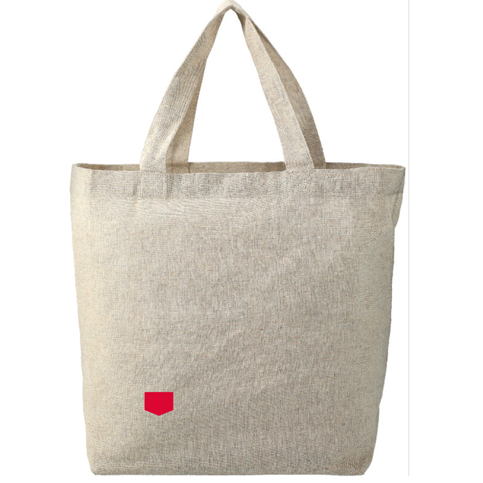 The 5oz cotton twill recycled grocery tote will be your go-to tote on grocery day and helps promote social responsibility. It is manufactured from pre-consumer waste generated by factories during the fabric cutting process. Approximately 70%-80% recycled cotton and 20-30% RPET. Through a partnership with 1% For The Planet, one percent of sales will be donated to nonprofits dedicated to protecting the planet. This tote comes with a sturdy covered bottom board, an open main compartment to hold your essentials and is decorated with the shield brand mark. Measures 13" H x 11" W x 6 D with a 7.5" handle drop.