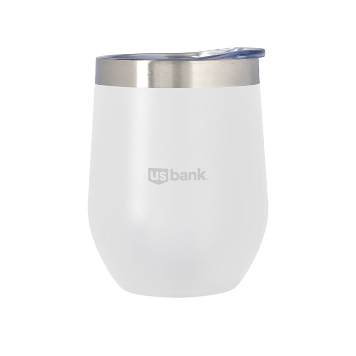 Keep your favorite beverages the perfect temperature with this vacuum-insulated tumbler with a snap-on sip-through lid and non-slip bottom. Powder coated finish in white with the U.S. Bank logo laser engraved on the side. Holds 12 ounces and is 4.5" tall. BPA free. Hand wash recommended. Constructed using 86% recycled post-consumer stainless steel and 12% recycled post-consumer acrylonitrile styrene.
