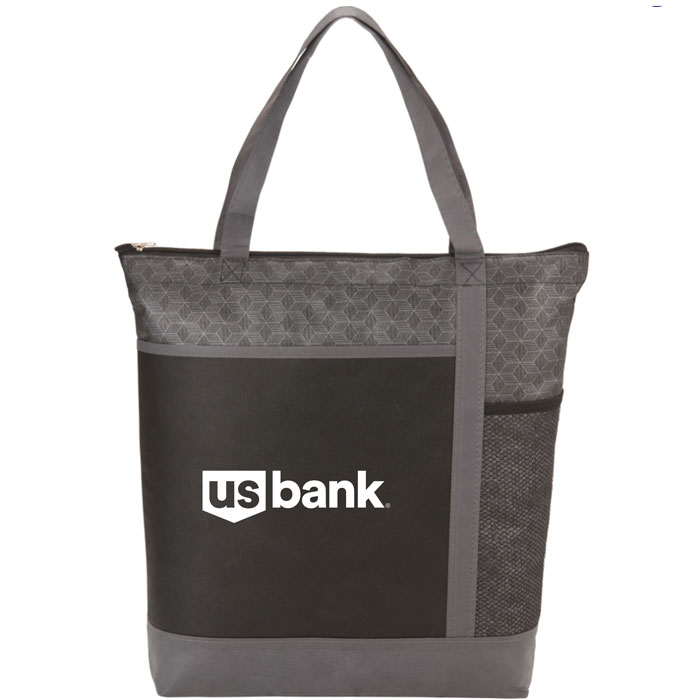 This non-woven convention tote features a mesh side accent pocket and zippered main compartment with the U.S. Bank logo silk screened on one side. Measures 16" x 16" with a 1" gusset