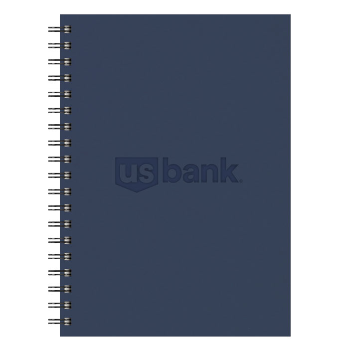 7" x 10" spiral bound notebook with recycled paperboard cover containing 100 sheets of lined, reycyled paper. U.S. Bank logo debossed on the front cover.