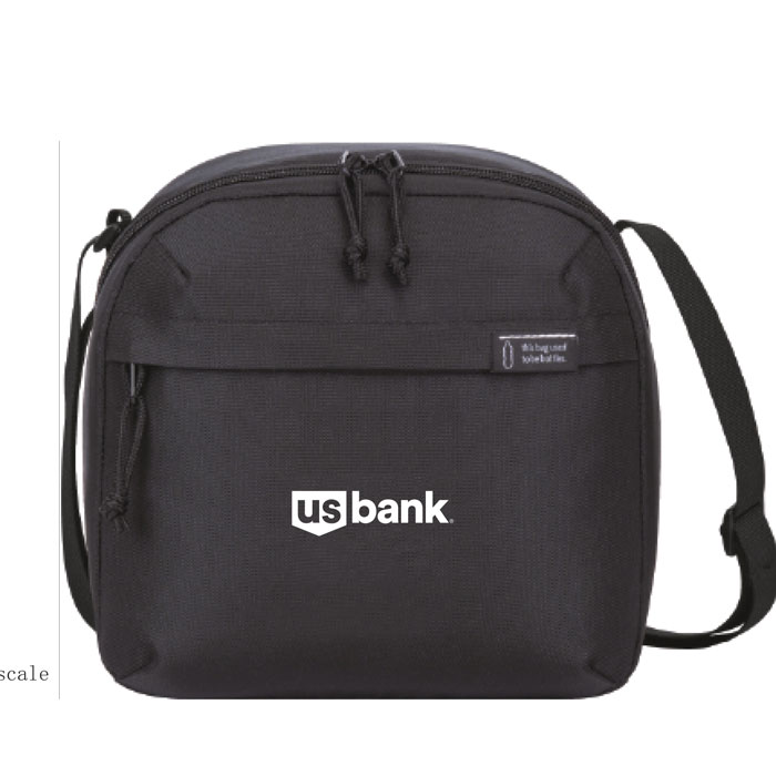 A modern and sustainable update to a classic lunch cooler using recycled fabric and webbing made from plastic bottles. Front zippered pocket for storing accessories with dual zippered, angled opening to insulated main compartment. Adjustable, ambidextrous shoulder strap for customized wearing. Holds 9 cans, Measures 9"L x 8.75"H x 5"W with the U.S. Bank logo silk screened on the front pocket.