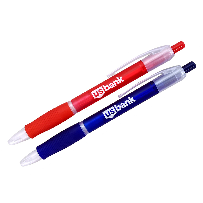 Slim translucent design, comfort grip and attractive price point will make this pen a favorite for office use and giveaways. Choice of red or blue body with black ink. Sold in packs of 25.