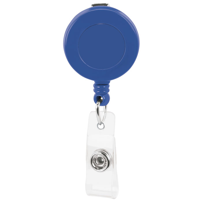 Keep ID badges easily accessible for daily use with this blue and white holder. Retractable cord measures 30" long. Alligator clip on back for securing to clothes or bag. This item is offered without a logo for security reasons in case of loss when used with employee IDs.