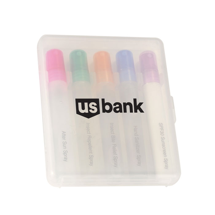 This 5-piece set include everything you need for the great outdoors - a 0.33 ounce spray bottle of hand sanitizer, SPF30 sunscreen, after burn spray, insect repellent & after bite spray. All components are packed inside a sturdy travel case measuring 5.25" H X 4.5" W X 0.875" D Meets FDA requirements.