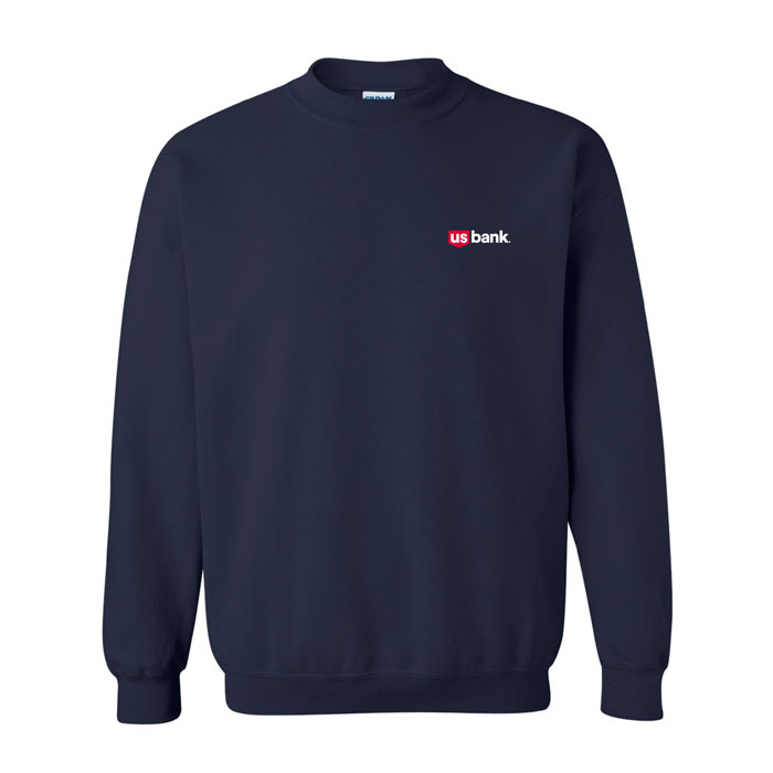 Gildan® Heavy Blend" crewneck sweatshirt offered in navy blue with the U.S. Bank logo silk screened on the left chest. Fabric is 50% USA cotton, 50% polyester.