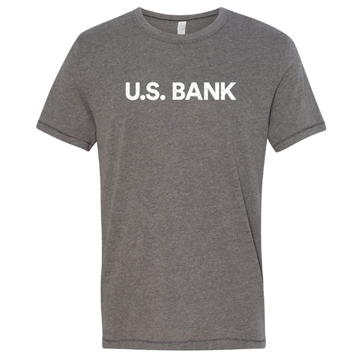 This vintage t-shirt from Alternative apparel is sure to be a keeper with the soft fabric feel and distressed U.S. Bank text on the front. This unisex shirt is offered in charcoal heather and constructed of 4oz fabric made of 50% cotton and 50% recycled polyester. Sizes 4XL and 5XL are a 4.5 oz cotton/poly blend from Hanes. The U.S. Bank logo is screenprinted on the left sleeve.