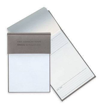 This sleek desk note pad contains 640 white blank pages with note area at the bottom and perforation at the top for easy removal. Measures 5 5/16" x 7 7/16" Sits beautifully on any desk with the First American Funds logo debossed on the gray leather-like cover.