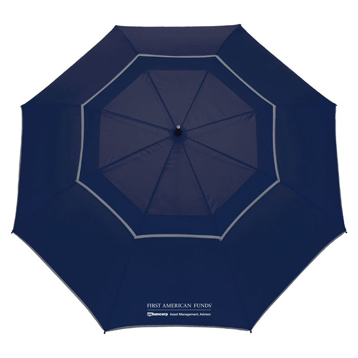 This auto open reflective golf umbrella utilizes automatically opening technology and features a double-vented canopy designed to withstand high winds. All fiberglass lightning resistant construction. This pongee golf umbrella has a reflective border around its canopy vents for improved visibility and safety in harsh weather conditions. Navy blue with the First American Funds logo in white on one panel.