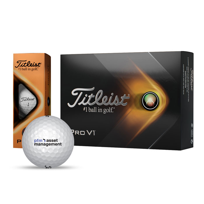 The Titleist Pro V1 is perfect for those that enjoy a soft feel, low spin, and fast balls. Branded with the PFM Asset Management logo. Sold by the dozen.