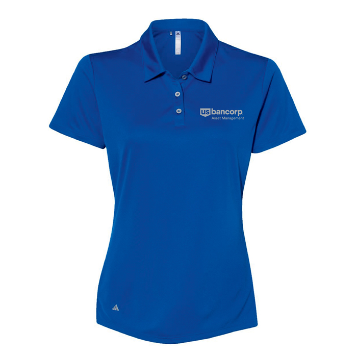 This lightweight polo shirt is construced of 100% recycled polyester with a hydrophilic finish to wich away moisture. Features include a ribbed knit collar, three-button placket and UPF 50+ protection. Offered in royal blue with a heat transfer U.S. Bancorp Asset Management logo on the left chest and the adidas logo on the right sleeve.