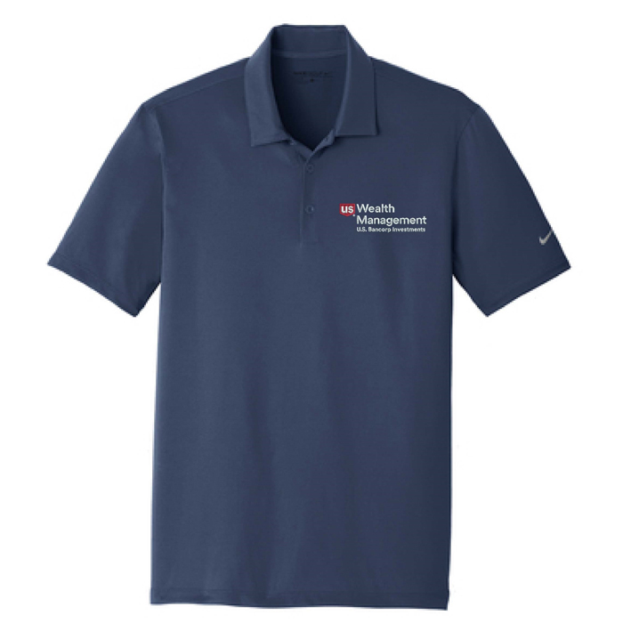 A modern tribute to the unparalleled Nike heritage, this sophisticated Legacy polo has a subtle, grid-like texture and is engineered with Dri-FIT moisture management technology. Design details include a self-fabric collar, three-button placket with dyed-to-match buttons and open hem sleeves. The U.S. Wealth Management/U.S. Bancorp Investments logo is embroidered on the left chest and contrast heat transfer Swoosh design trademark is on the left sleeve. Offered in navy blue, 4.2-ounce, 100% polyester Dri-FIT fabric.