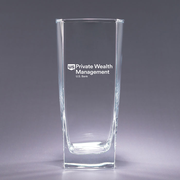 16 oz beverage glass with square base, rounded rim and etched Private Wealth Management logo. Set of 4 glasses.