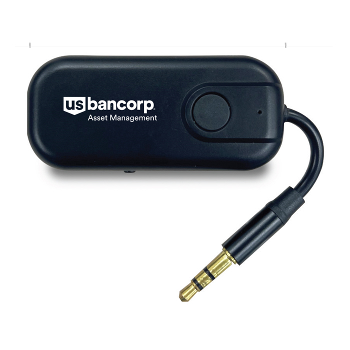 The wireless transmitter lets you pair your headphones or earbuds with devices like TVs, gaming systems, and even gym equipment. It’s perfect for watching movies on a plane or enjoying entertainment on a road trip. The transmitter pairs automatically, so you can relax and watch without disturbing others. Branded with the U.S. Bancorp Asset Management logo.